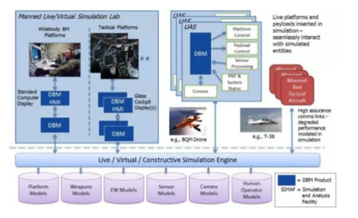 • 2018年1月,DARPA已向BAE系統公司授予DBM項目第三階段合同,前兩階段發展的成果能讓有人/無人機編組在干擾環境中飛行,具備回避威脅和攻擊目標的能力。圖3是DBM項目的能力驗證環境。